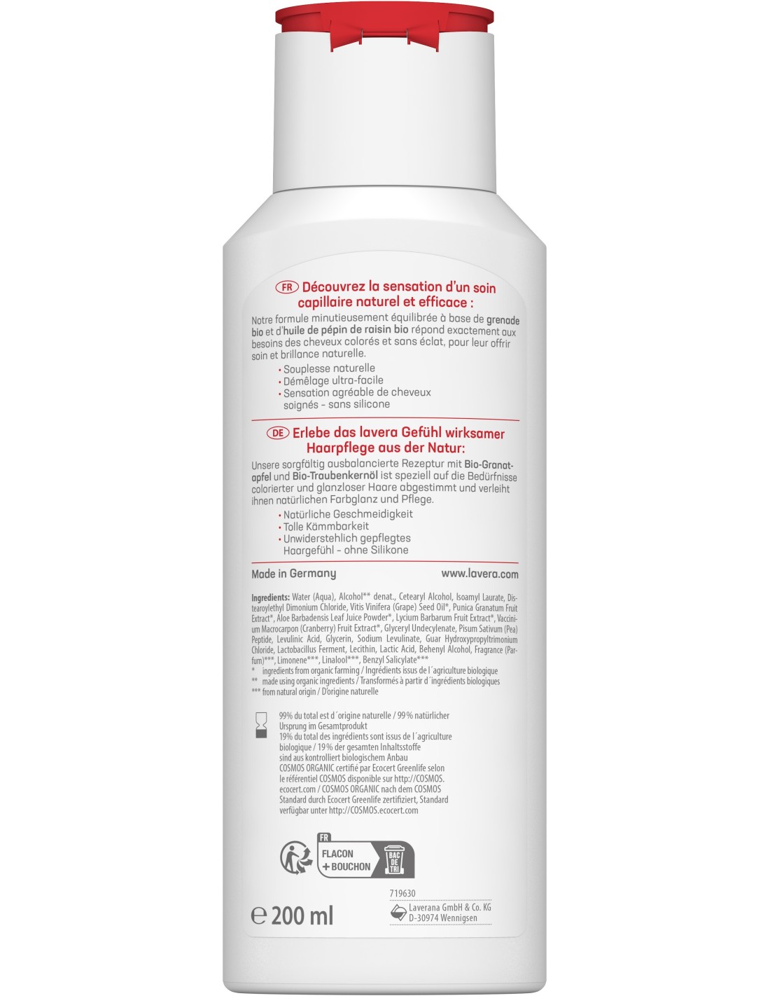 Grâce à la formule innovante à base de grenade bio et d'huile de pépins de raisin bio Lavera, vos cheveux sont enrichis en nutriments essentiels en toute naturalité et réparés de manière ciblée.