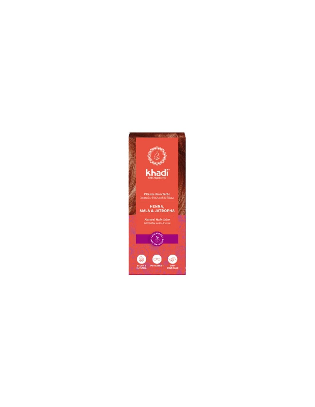 - Le henné pur qui colore la chevelure d'un roux est ici légèrement foncé par le jatropha. On obtient alors un brun à brun-acajou.