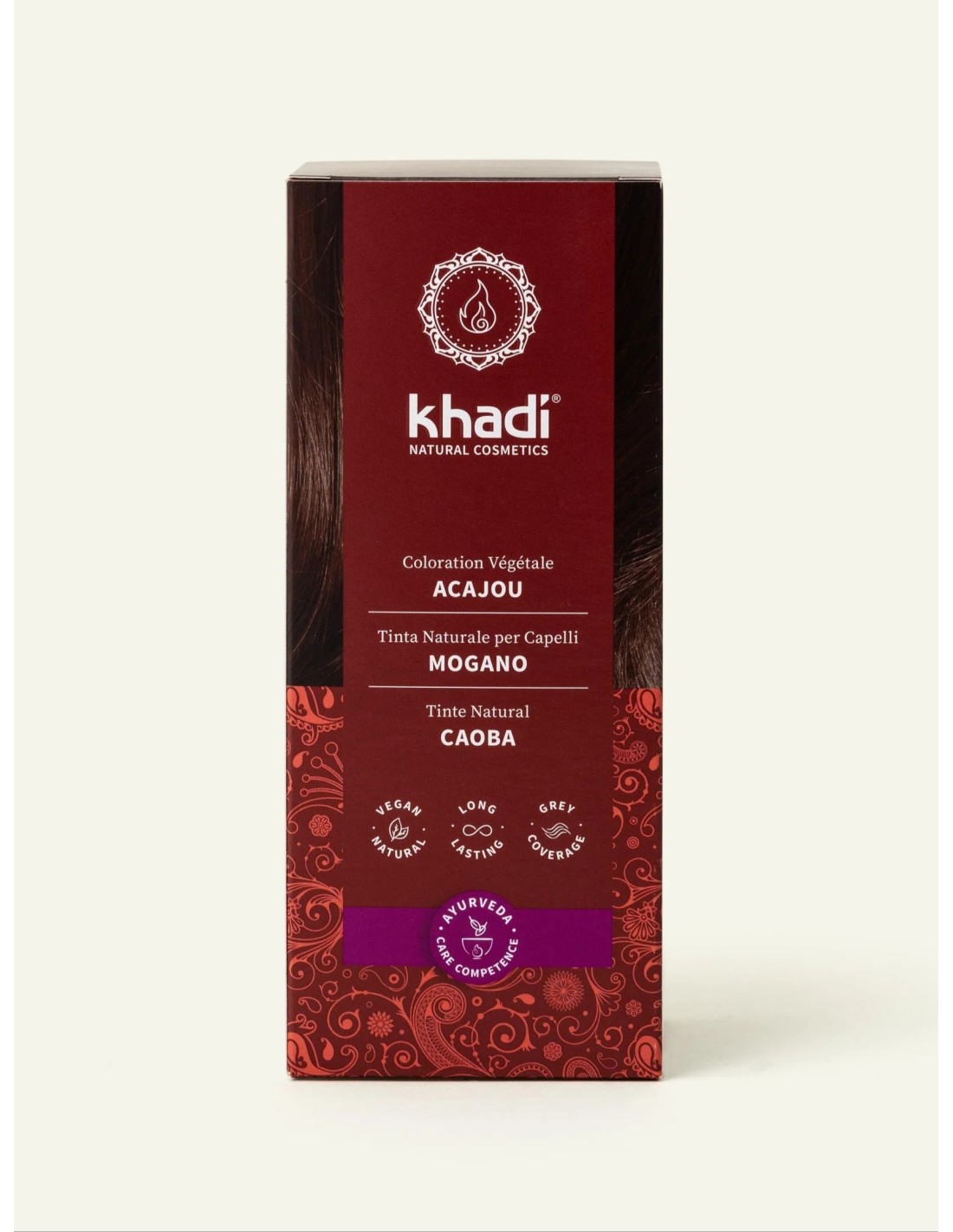 La coloration végétale Acajou de Khadi offre un brun-roux profond.