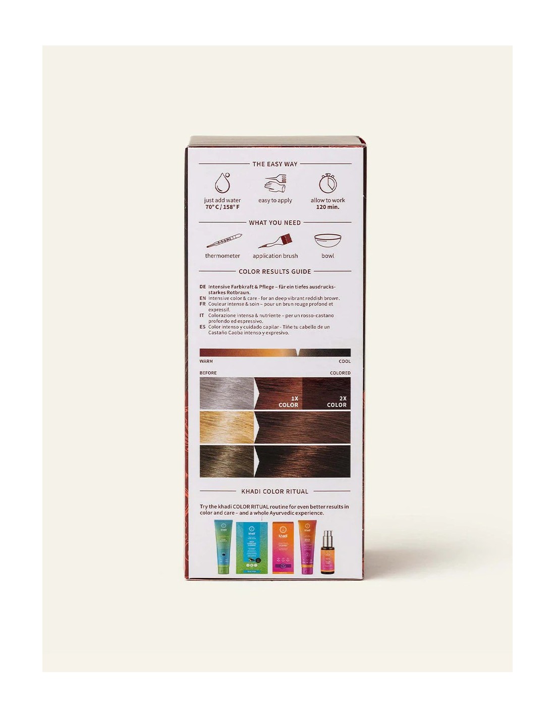 Sur cheveux clairs ou gris, la teinte tendra vers un acajou lumineux et chaleureu.