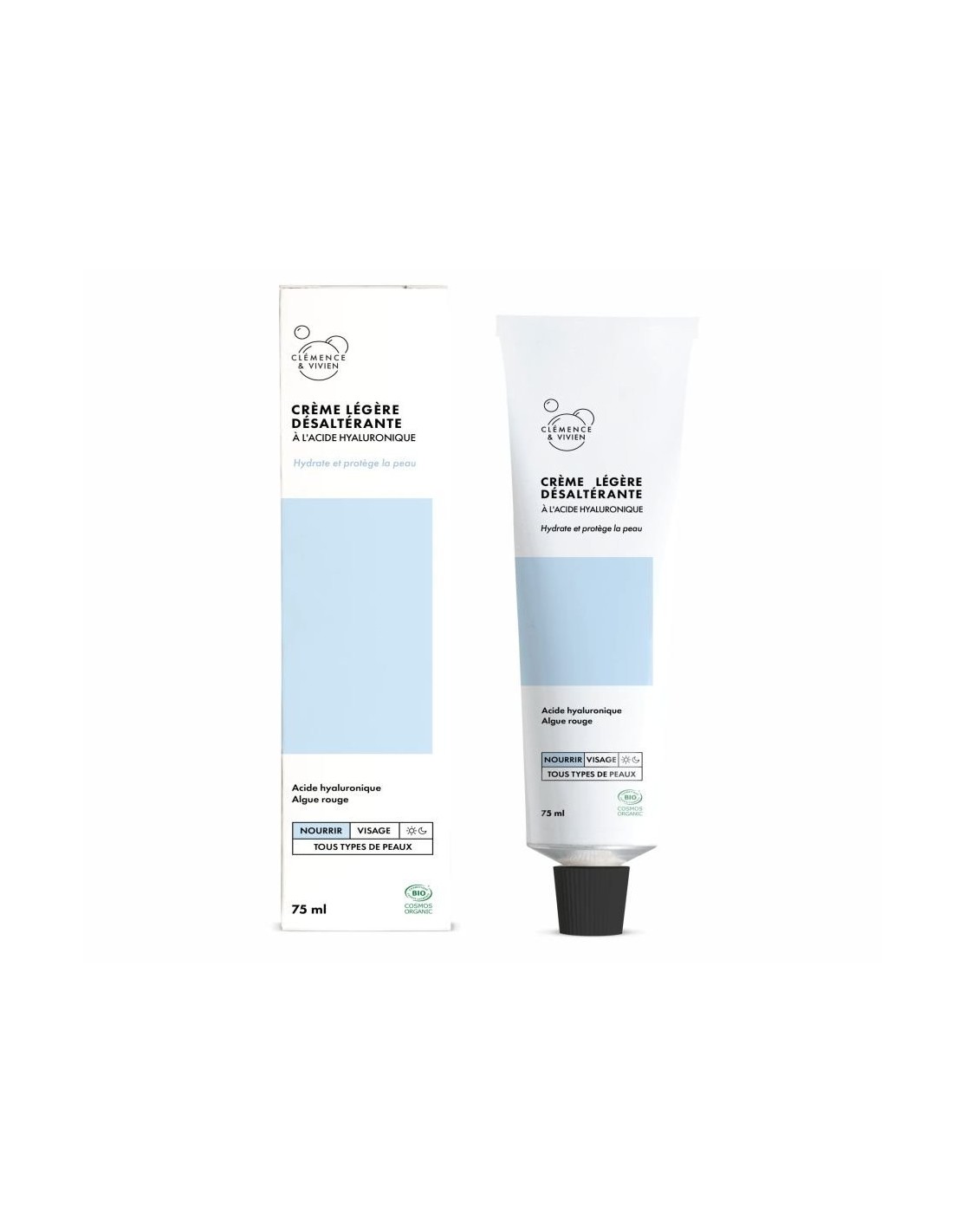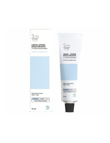 Ingrédients biologiques hydratants (acide hyaluronique végétal, aloe vera, glycérine végétale) et agents émollients naturels.