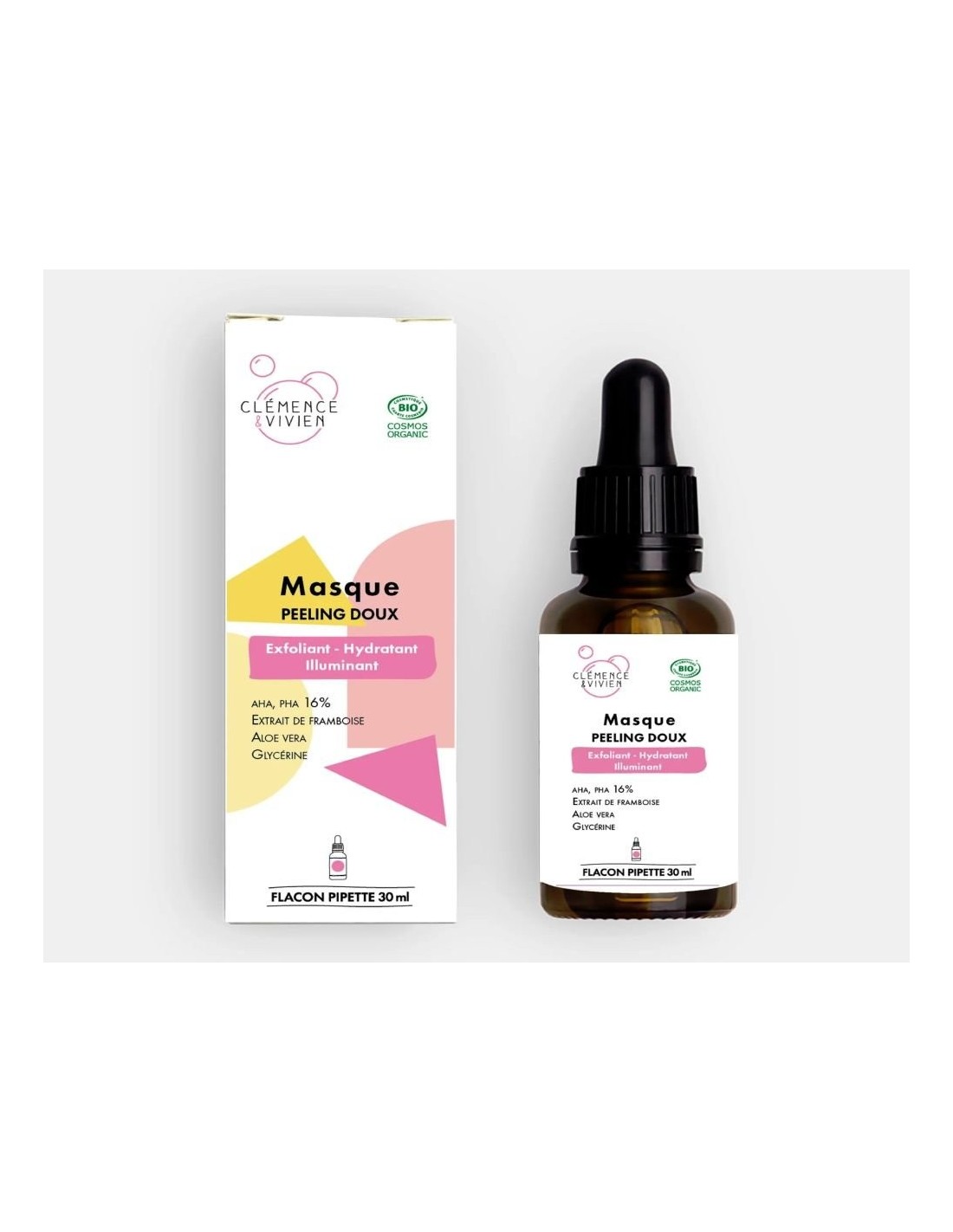 Extraits naturels exfoliants doux (acides de fruits, poudres végétales), agents purifiants et ingrédients biologiques hydratants.