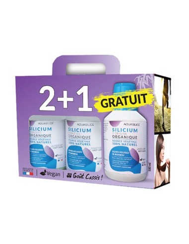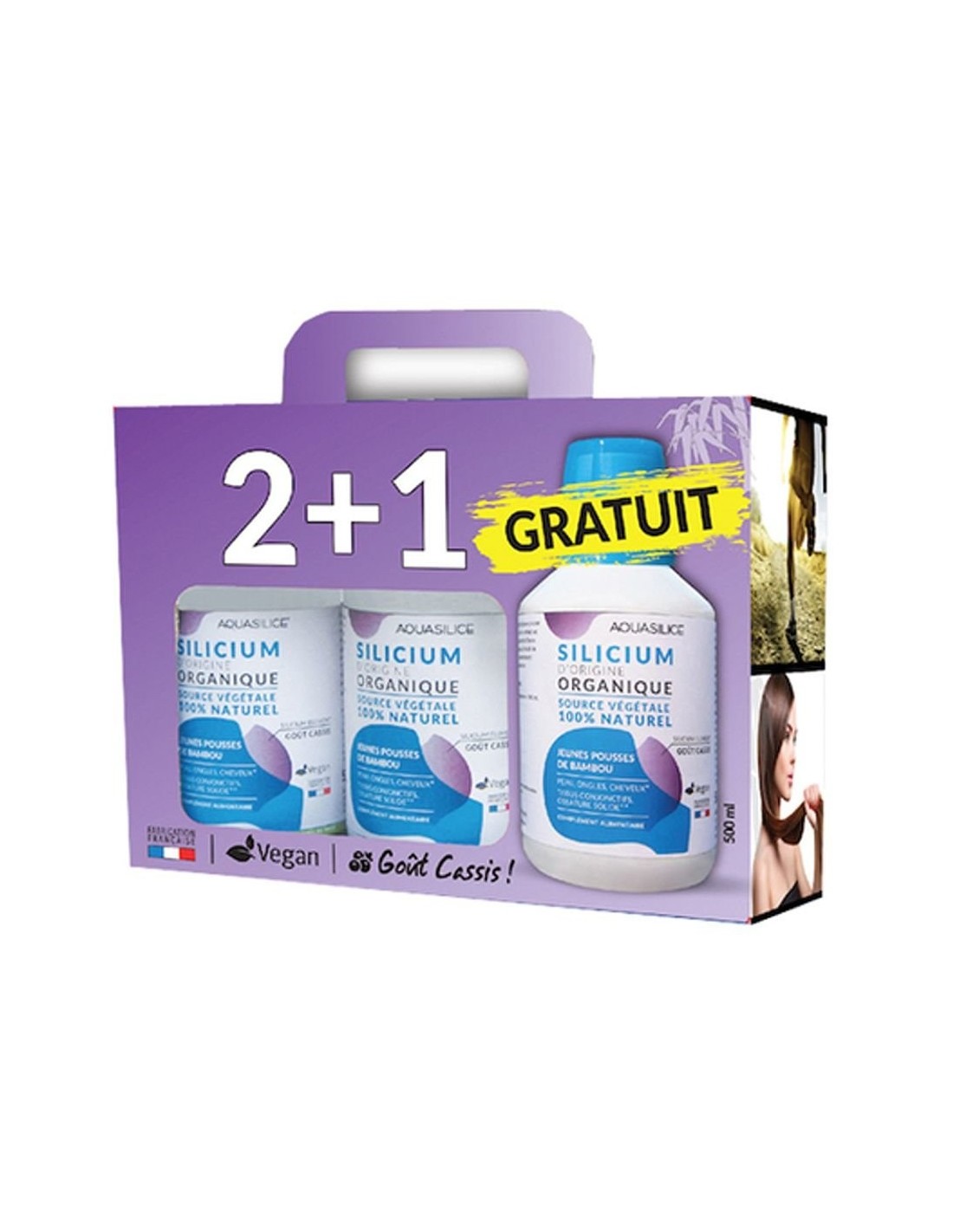 Le silicium organique 100 % naturel d’Aquasilice est un complément alimentaire liquide formulé à partir d’extraits végétaux riches en silice, comme les jeunes pousses de bambou, l’ortie et la reine des prés, avec un arôme naturel de cassis. Il se présente en lot 3 × 500 ml (2 + 1 gratuit) pour une cure beauté prolongée.