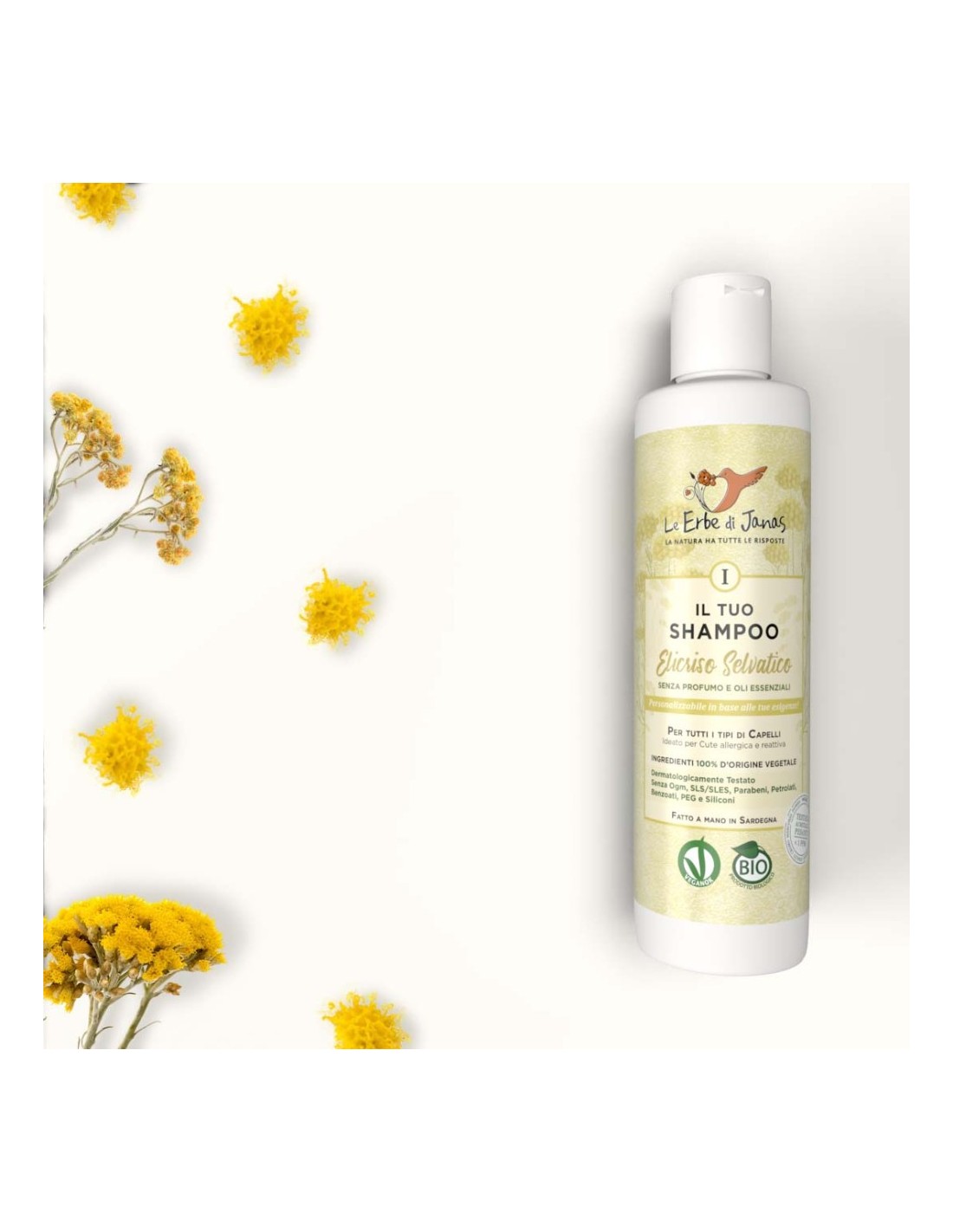 Ce shampoing bio à l’élicriso sauvage de Sardaigne est un soin naturel qui nettoie tout en douceur les cheveux de tous types. Il est formulé sans parfums, sans huiles essentielles et sans benzoates, ce qui le rend particulièrement adapté aux cuirs chevelus sensibles, réactifs ou irrités.