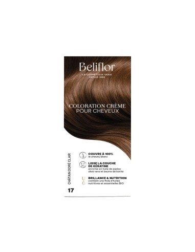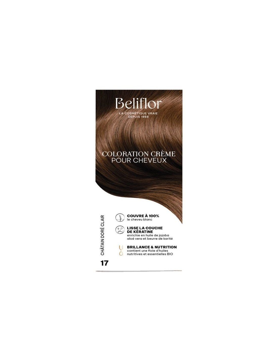 La coloration crème n°17 Châtain Doré Clair de Beliflor est une coloration permanente douce qui combine couleur intense et soin capillaire. Sa formule sans ammoniaque, sans paraben et sans sels métalliques agressifs respecte le cuir chevelu tout en offrant une teinte châtain doré clair lumineuse et naturelle.