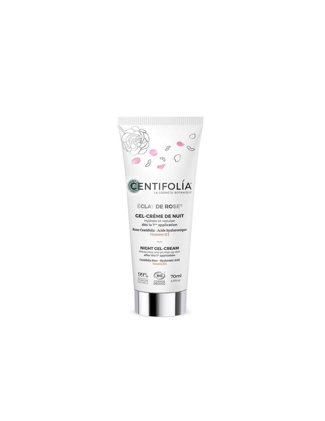 Ce gel-crème de nuit combine trois actifs naturels clés pour optimiser la régénération cutanée nocturne : l’extrait de Rose Centifolia, l’acide hyaluronique et la vitamine C. La rose Centifolia apporte des propriétés hydratantes, antioxydantes et apaisantes qui contribuent à révéler l’éclat du teint. L’acide hyaluronique capture l’eau dans les couches superficielles de la peau, améliorant l’hydratation et la fermeté, tandis que la vitamine C aide à illuminer le teint et à protéger la peau contre les radicaux libres responsables du vieillissement cutané prématuré.