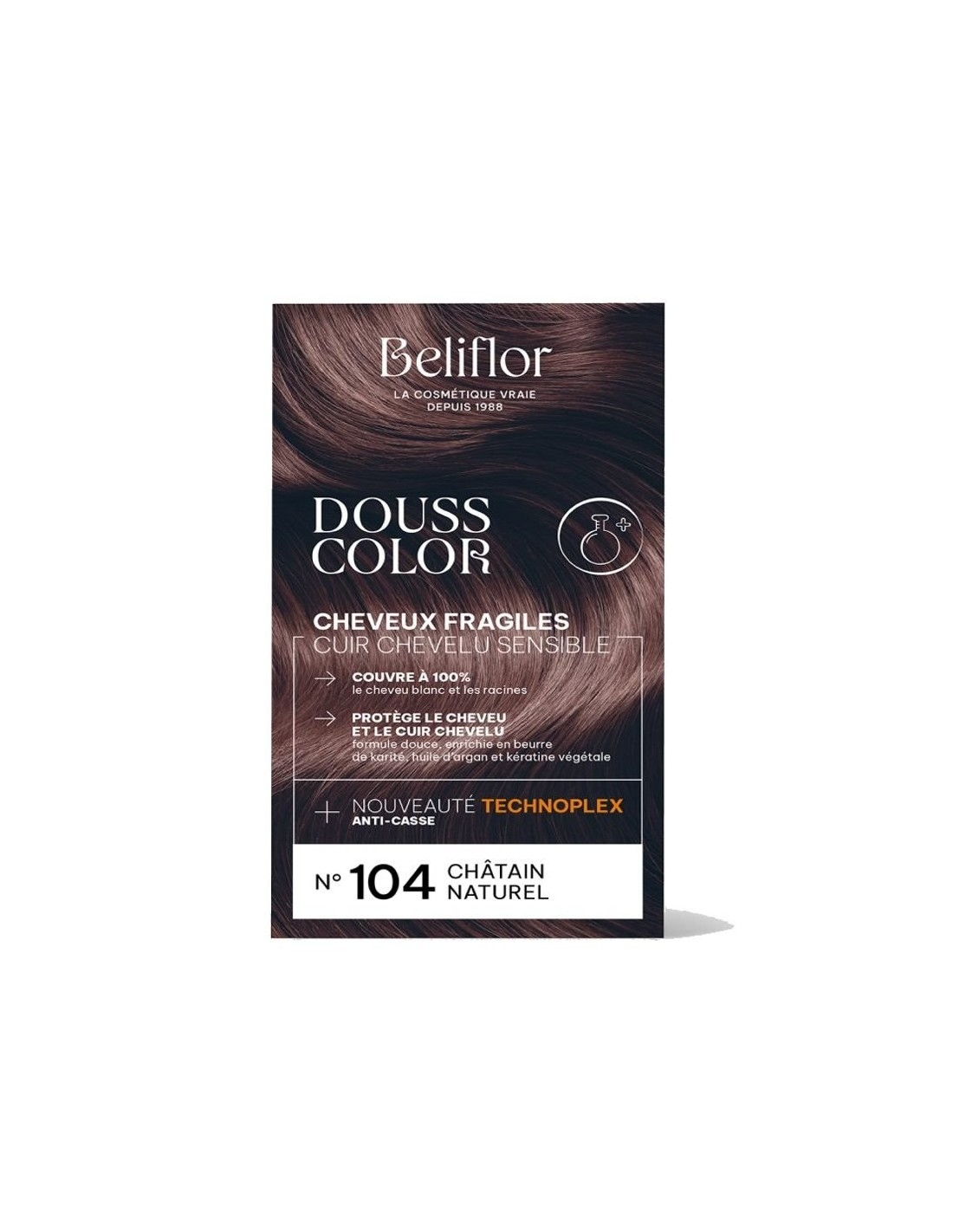 La coloration DoussColor 104 Châtain Naturel est une coloration permanente enrichie en extraits végétaux, conçue pour colorer les cheveux tout en les respectant.